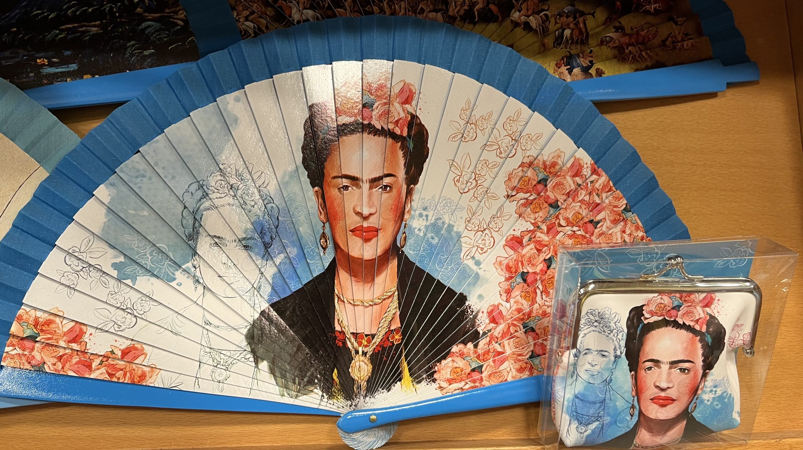 Abanico y Monedero Frida kahlo. Abanico de madera azul y tela de algodón con serigrafía de la imagen de esta gran artista , icono mundial . El monedero esta estampado con el mismo diseño que el abanico , cierre de metal.