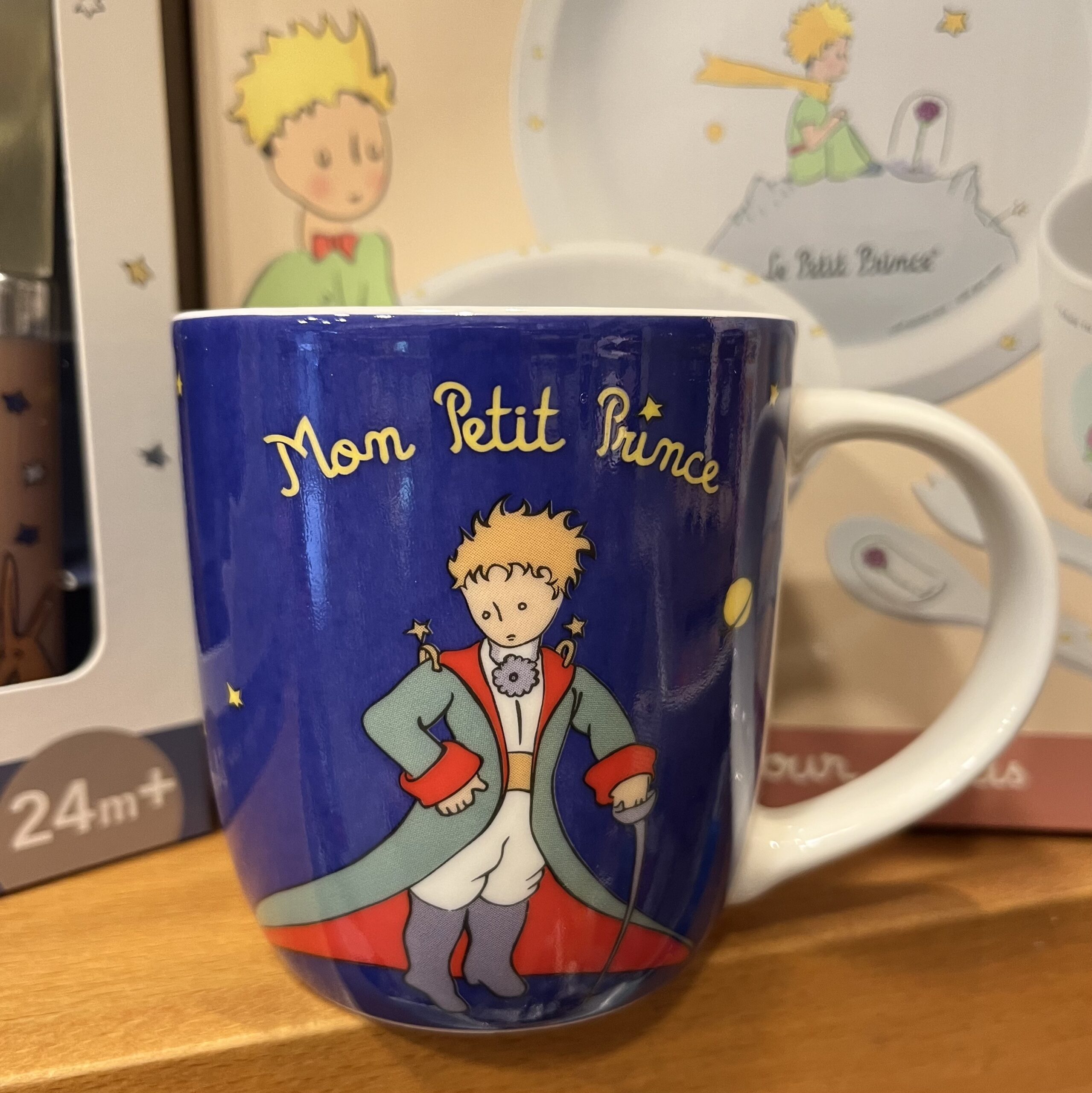juego de dos Tazas tamaño pequeño, ideales para cortados o para niños, porcelana alemána .  “Mom petit prince “ con fondo en azúlete haciendo aguas y estrellas . El petit prince está vestido de gala