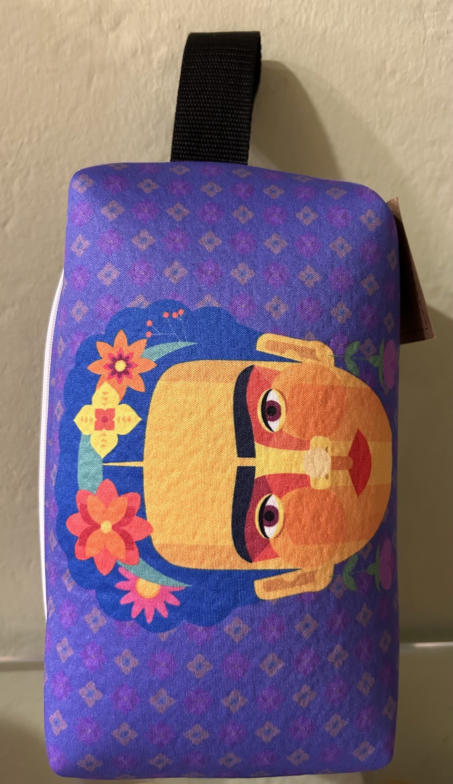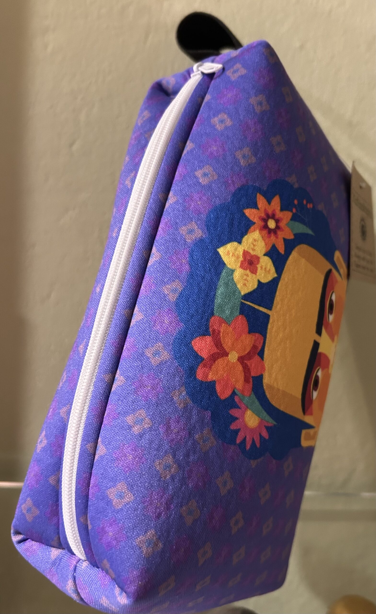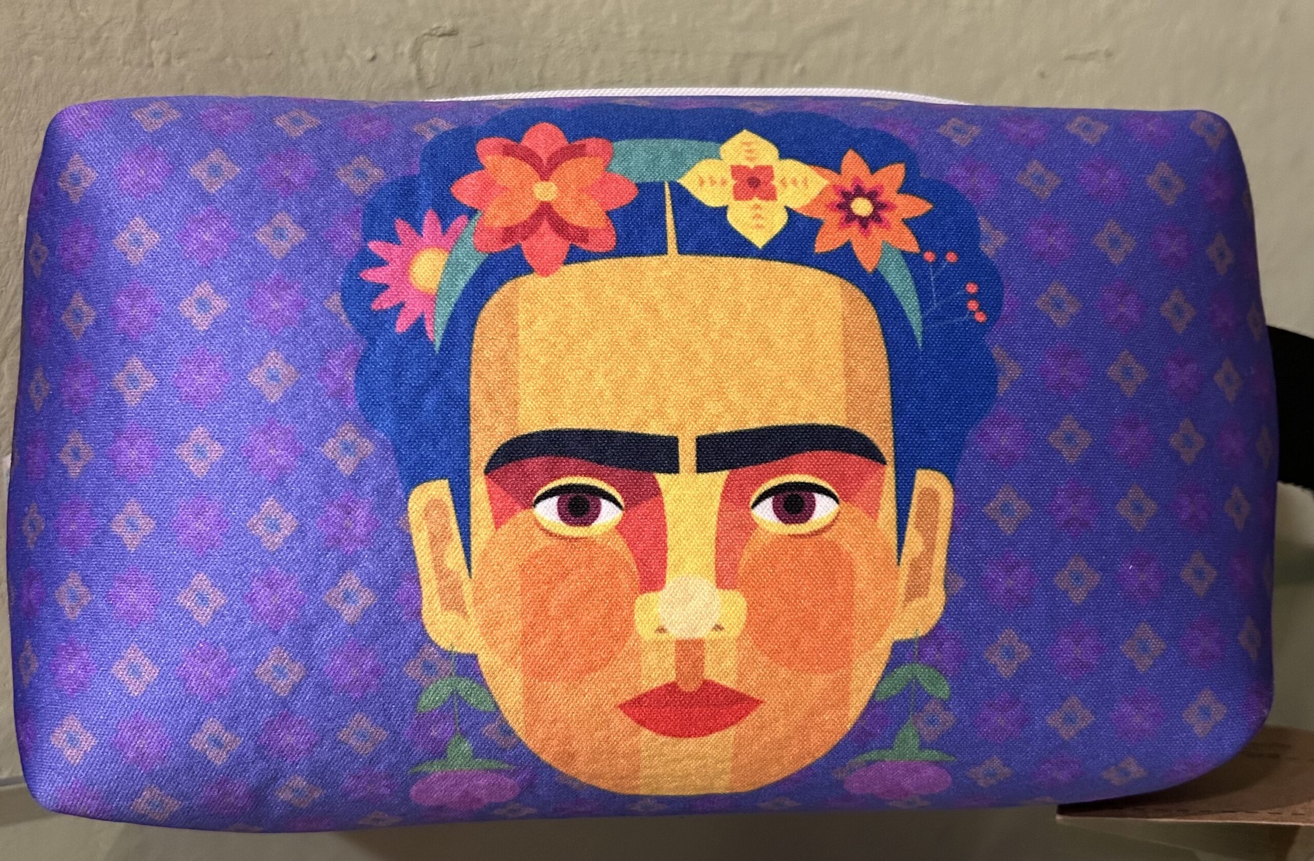 Neceser Frida Kahlo, o estuche de tela color lila y estampado de Frida kahlo , textura neopreno sedoso..