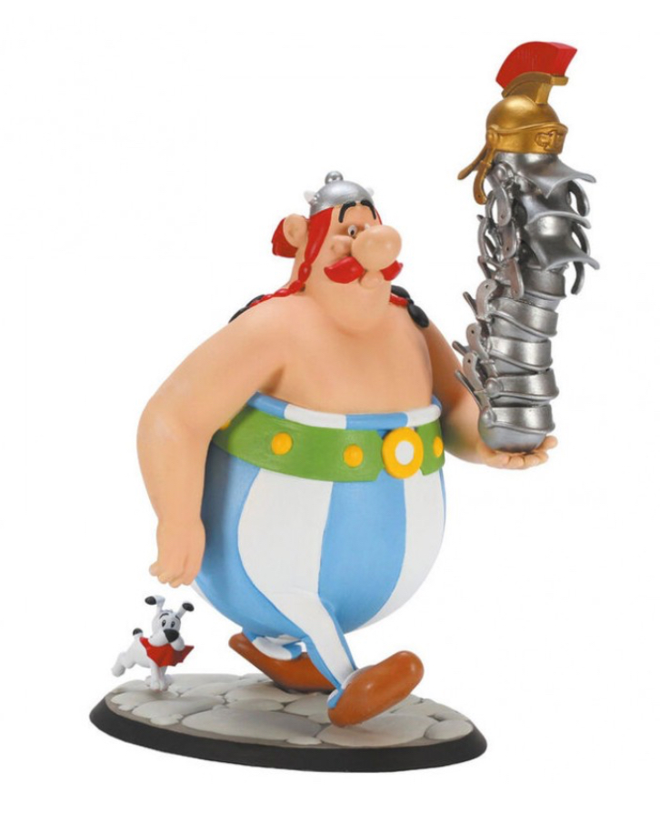 Figura de Obelix . Nuestro héroe Galo se encuentra portando una pila de cascos de guerreros romanos . Esta figura de Obelix está realizada en pvc. La figura de Obelix sirve también como un adorno precioso. Mide 20 cms , aproximadamente de altura.