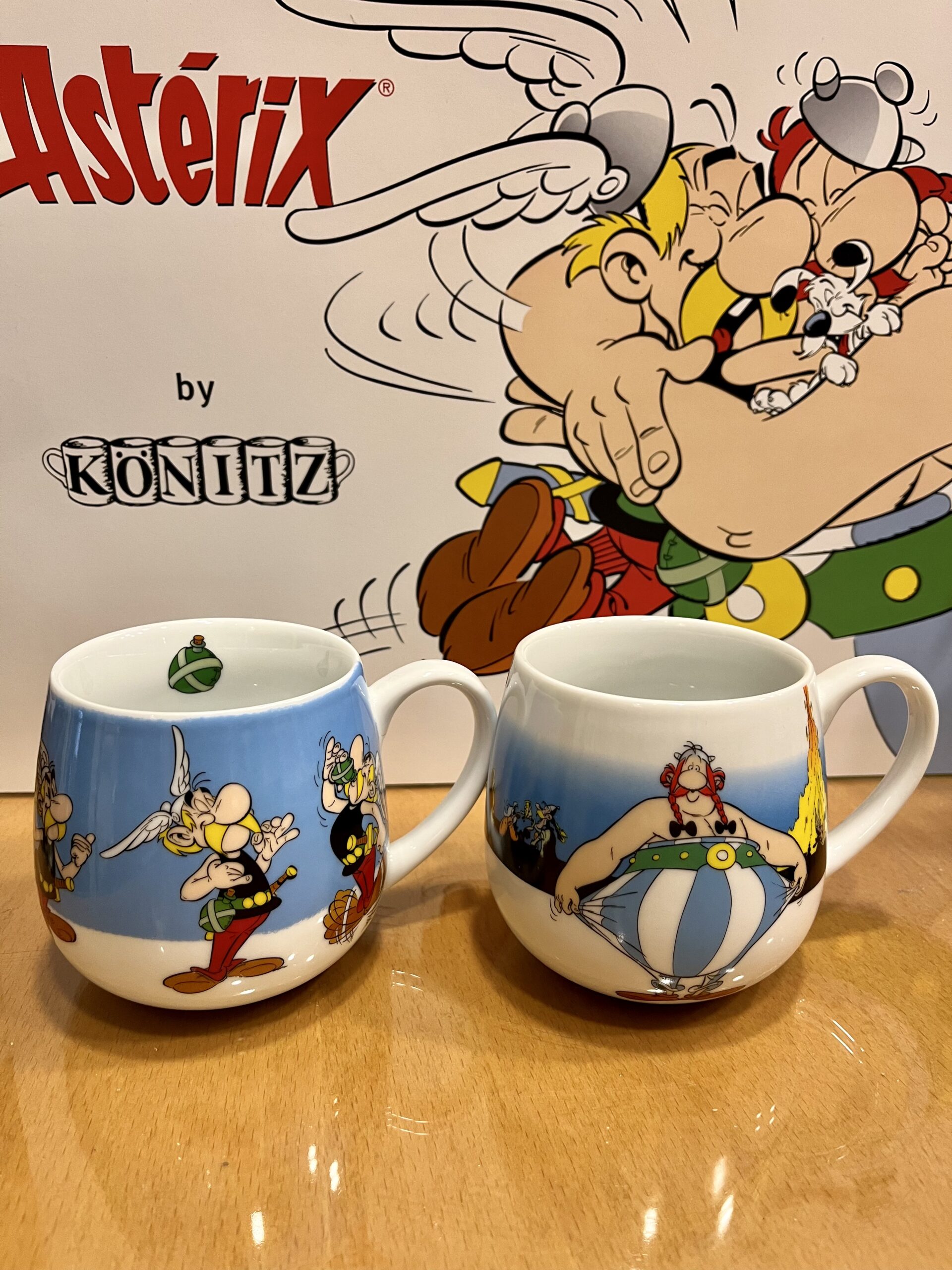 La taza de Obelix tiene dibujado a este personaje con la típica postura estirándose los pantalones y por detrás una escena con personajes alrededor de una hoguera y la frase …que él no está gordo ( en el idioma original francés de los cómics) JE NE SUIS PAS GROS!!!