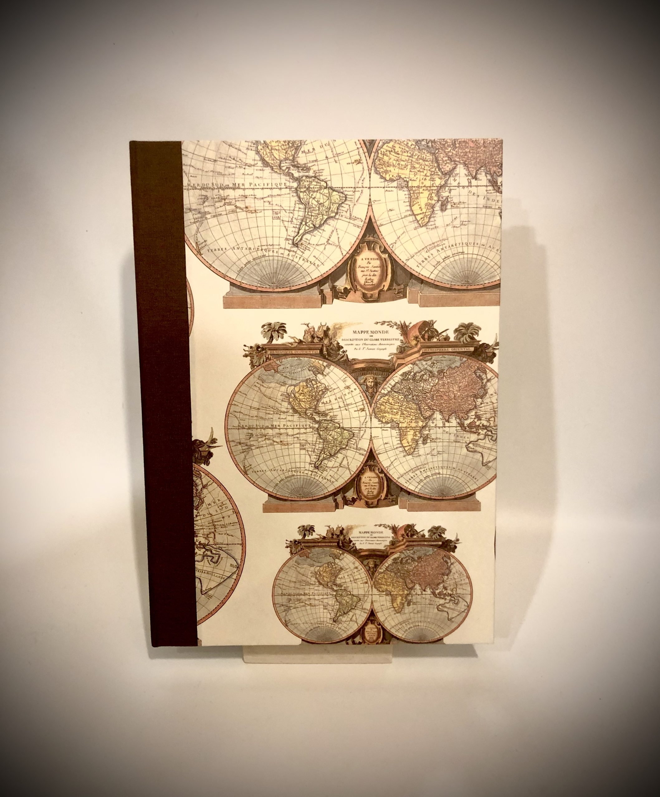Libreta de viajes mapa mundi antiguo . libreta viajes tipo cuaderno de anotación para guardar todo lo que nos interese en nuestros viajes . Encuadernada a mano , cosida y lomo de tela , estampado mapas mundi. Buenos acabados artesanales realizados con mucho gusto y gran calidad . 80 hojas de papel verjurado de grosor 90 gr , color crema . medidas 24,5 x 17 x 1,5