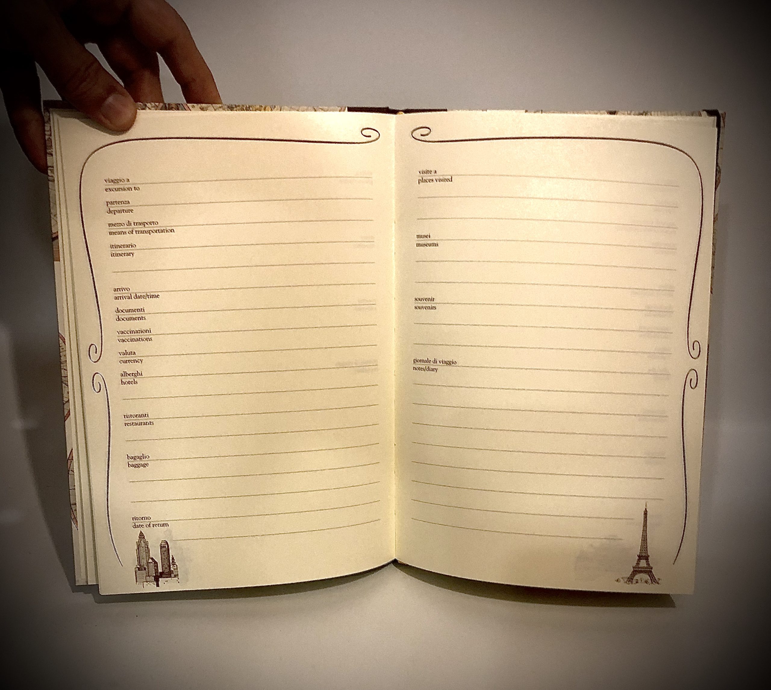 libreta viajes tipo cuaderno de anotación para guardar todo lo que nos interese en nuestros viajes . Encuadernada a mano , cosida y lomo de tela , estampado mapas mundi