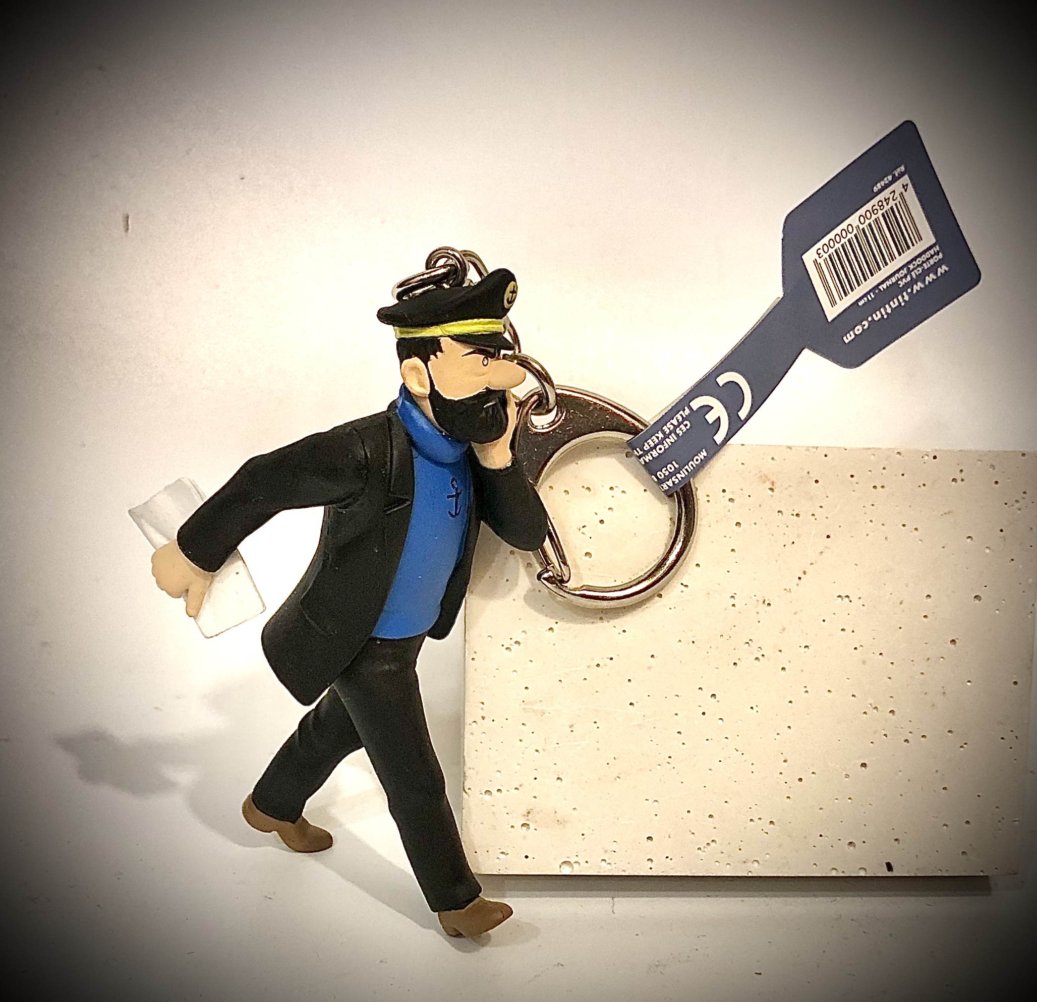 llavero de pvc cuerpo entero del capitán Haddock sorprendido y con periódico en la mano , realizado en pvc y anilla metálica . Altura 9 cms . Pintado a mano.