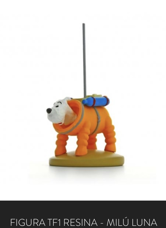 Esta figura de Milu astronauta pintada a mano, aparece en algunas viñetas de los cómics Objetivo La Luna y aterrizaje en la luna.