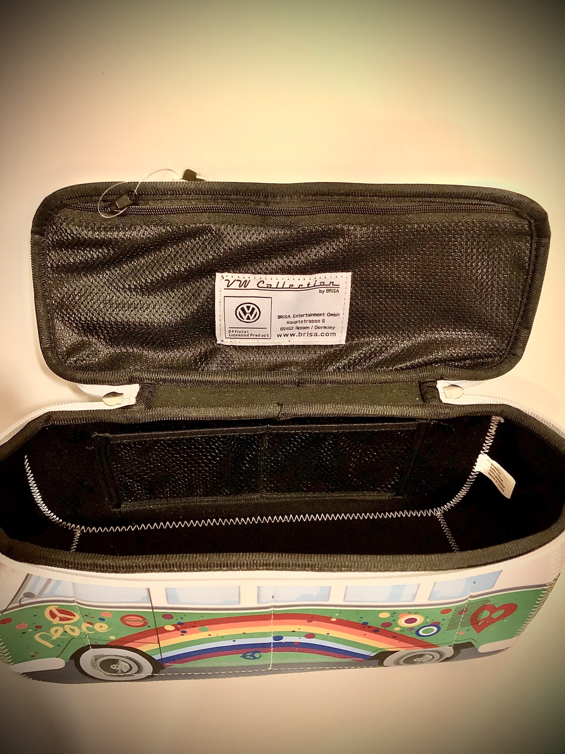 Neceser Volkswagen grande de neopreno, color negro y granate , interior negro, cremallera metal. Tiene bolsillos interiores. Por el material en el que está realizado tiene muy buena limpieza. Hay diferentes modelos y colores. Medidas 23 x 11 x 9 cms .