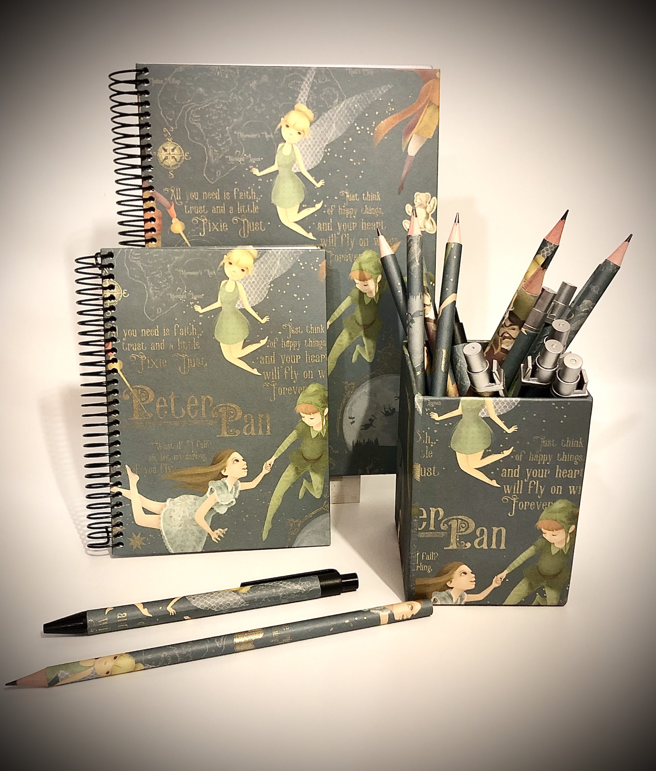 Conjunto de escritura Peter Pan. Conjunto de 5 piezas , libreta pequeña encuadernada con gusanillo de 11×15, libreta grande gusanillo 14×21, bote para lapiceros 7x7x10 , un lápiz y un bolígrafo. espiral con tapa dura