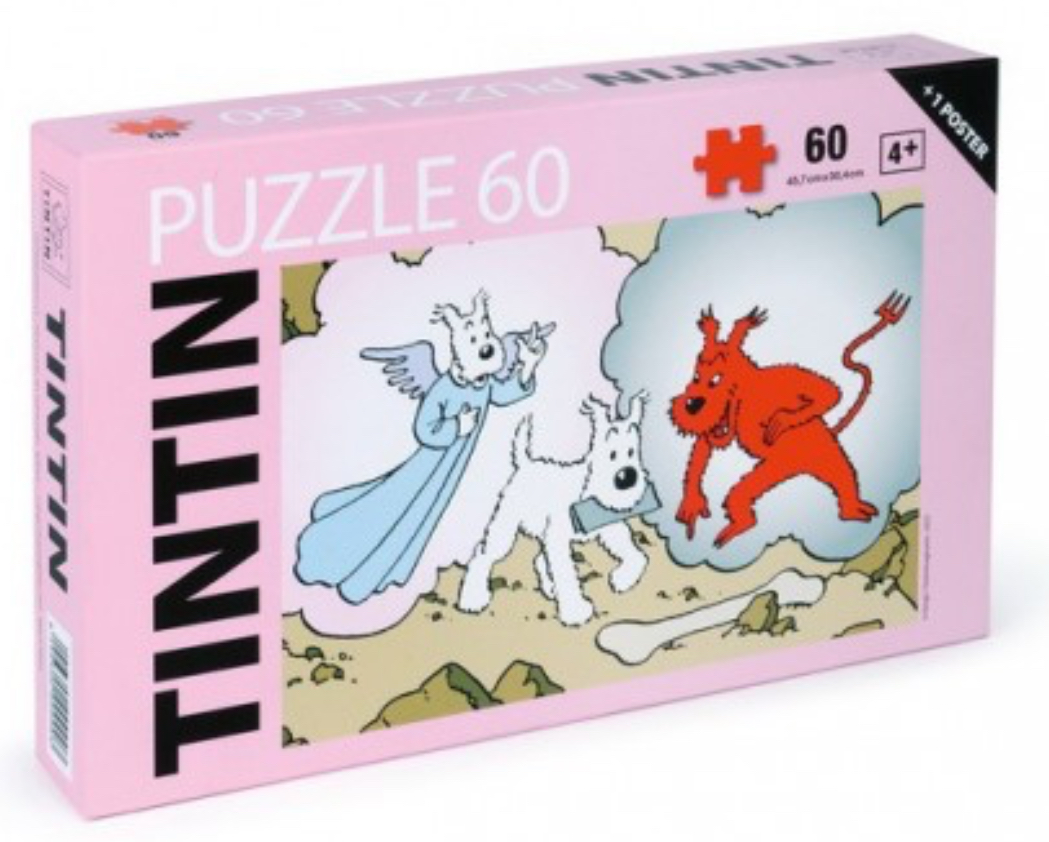 puzzle Tintin , Milú ángel y demonio de 60 piezas 45,7 cms x 30,4 cms , rectangular , piezas grandes . Para usar a partir de 4 años .