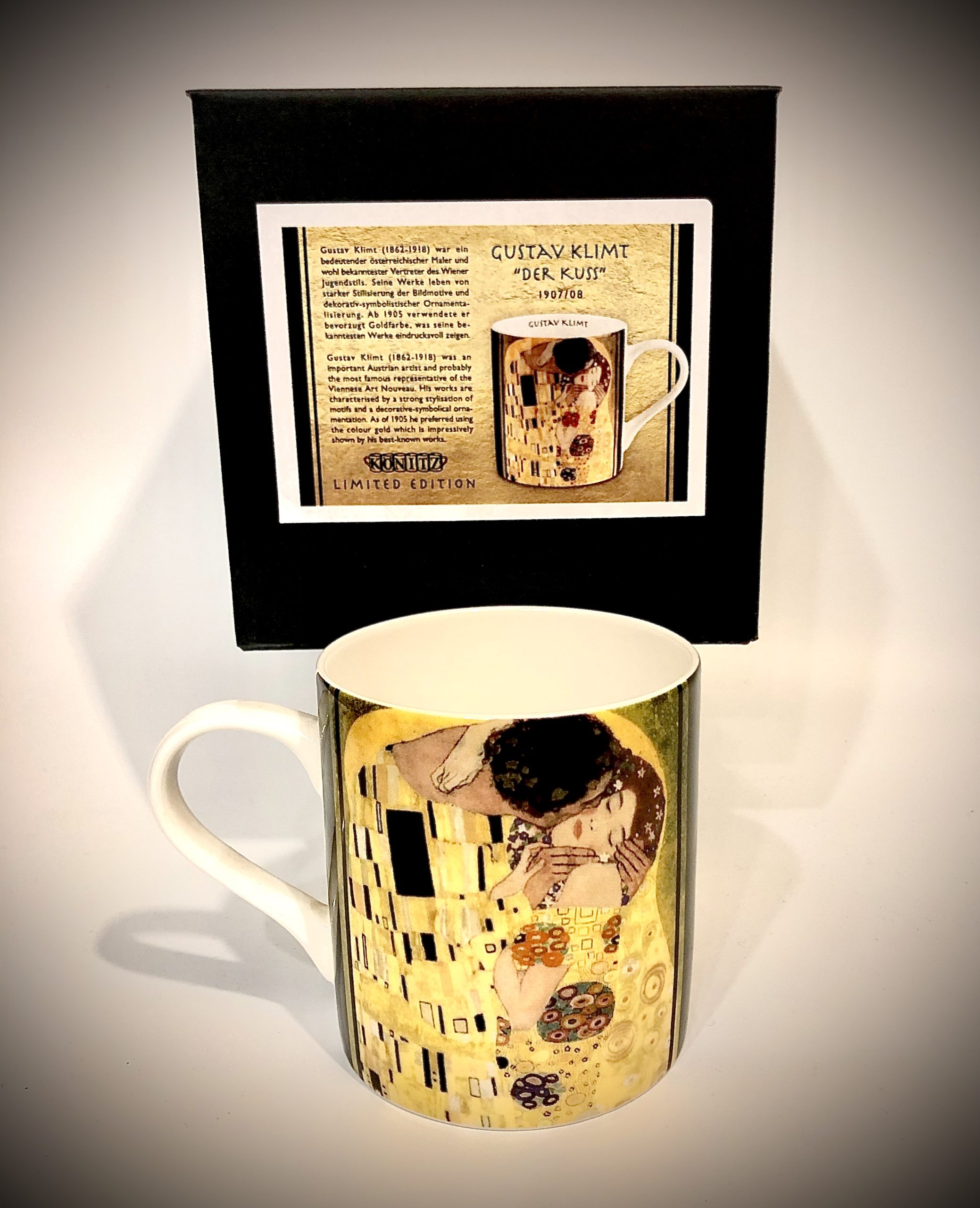 Taza Gustav Klimt. Taza de porcelana fina , fabricación alemána ( konitz )con diseño del beso de Gustav Klimt. Se entrega con caja de cartón a juego. Medidas 8 x 8 cms . Apta para lavavajillas y microondas.