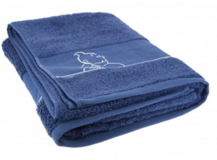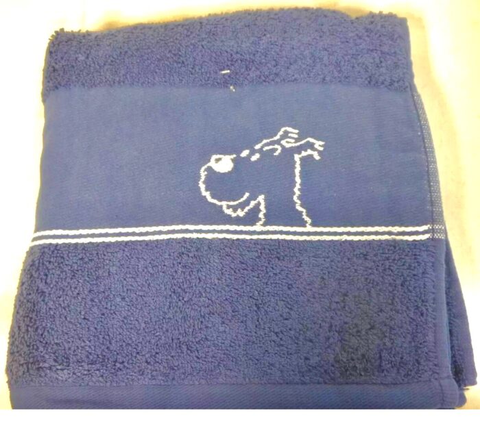 Toalla en color azul índigo con bordado en blanco del rostro de Tintin y de Milu.