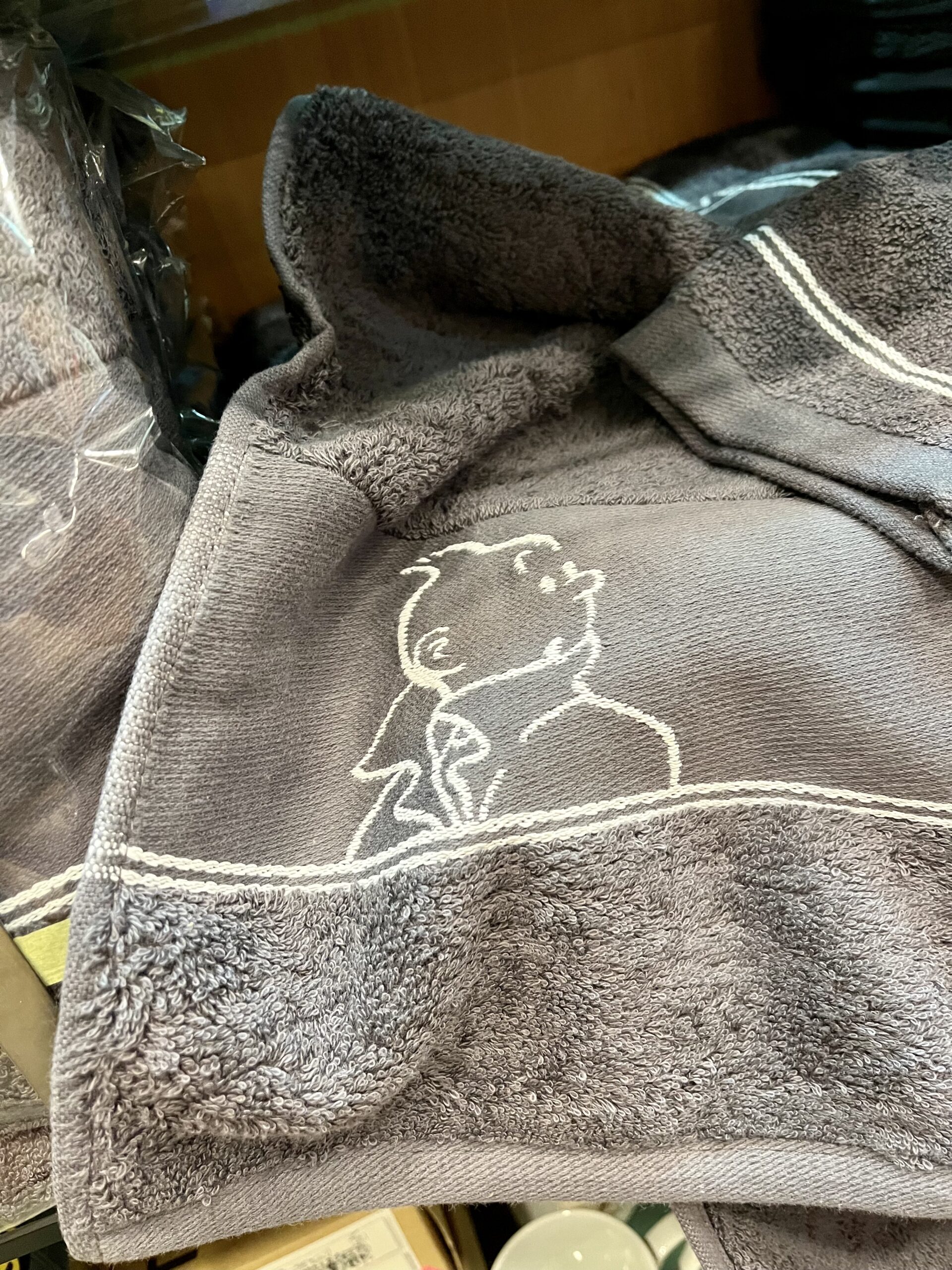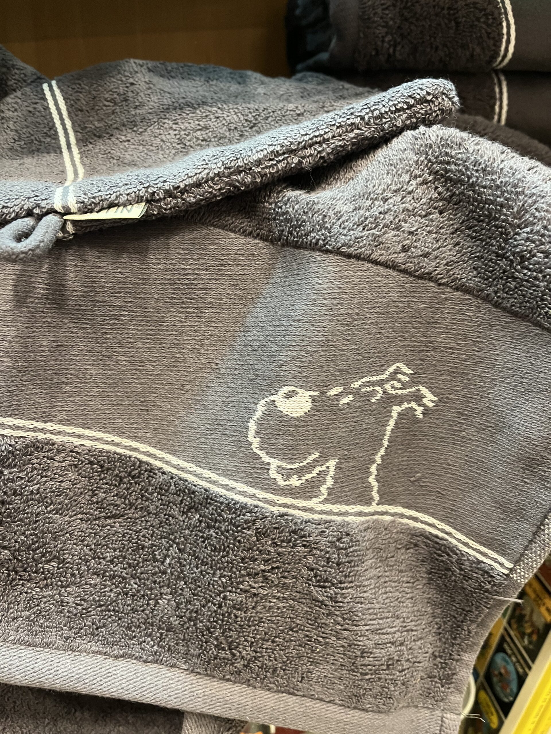 Toallas en color gris acero con bordado en blanco del rostro de Tintin y de Milu. Lleva una manopla haciendo juego