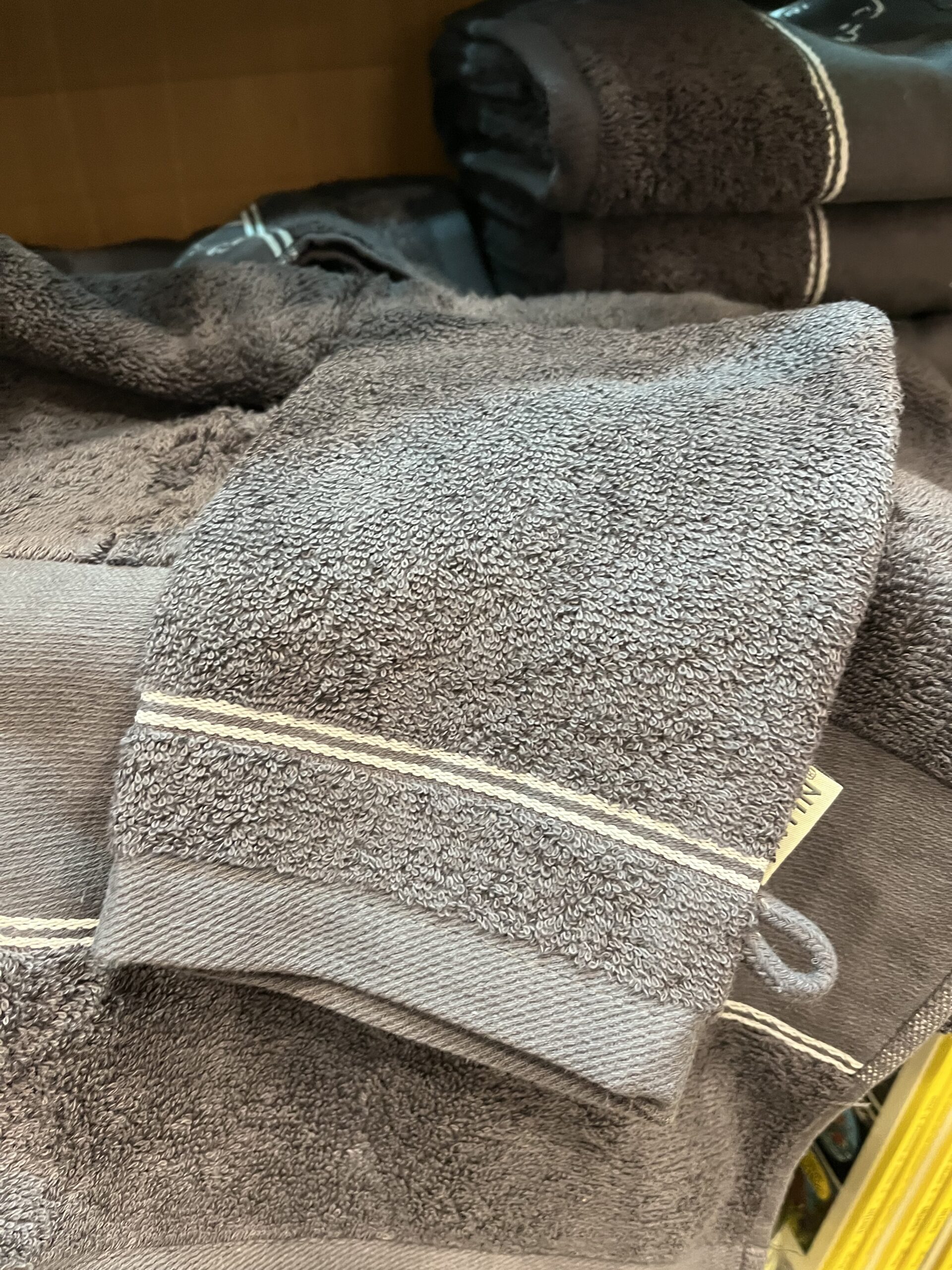 Toallas en color gris acero con bordado en blanco del rostro de Tintin y de Milu. Lleva una manopla de baño para a quien le gusta lavarse con ellas, haciendo juego con la toalla.